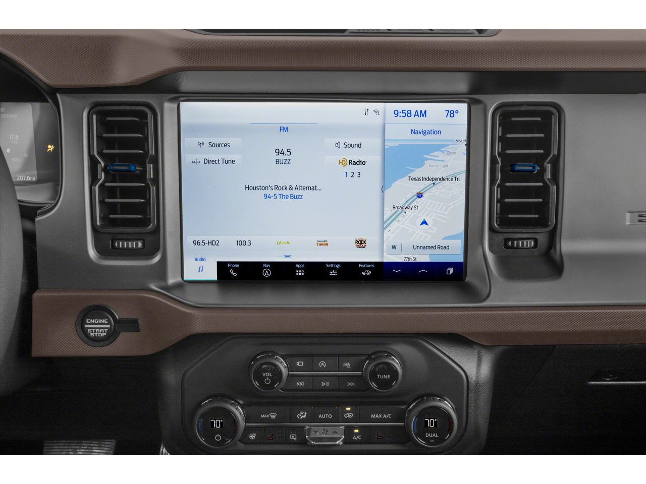 12 LCD Capacitive Touchscreen w/Swipe Capability, 18 Bright Machined Aluminum Wheels, 3.73 Axle Ratio, 360-Degree Camera, 4-Wheel Disc Brakes, 6 Speakers, ABS brakes, Additional Sound Deadening, Air Conditioning, Alloy wheels, AM/FM radio: SiriusXM with 360L, AM/FM Stereo, Auto High-beam Headlights, Auto-dimming Rear-View mirror, Automatic temperature control, Auxiliary Switches, Brake assist, Carbonized Gray Molded-In-Color Hard Top, Cargo Area Protector, Compass, Connected Navigation, Delay-off headlights, Driver door bin, Driver vanity mirror, Dual front impact airbags, Dual front side impact airbags, Electronic Stability Control, Emergency communication system: 911 Assist, Equipment Group 313A High Package, Exterior Parking Camera Rear, Front & Rear Floor Liners w/o Carpet Floor Mats, Front anti-roll bar, Front Bucket Seats, Front Center Armrest, Front dual zone A/C, Front fog lights, Front License Plate Bracket, Front Parking Sensors, Front reading lights, Front Row Top Panels Storage Bag, Front wheel independent suspension, Fully automatic headlights, Hard Top Sound Deadening Headliner, Heated Cloth Bucket Seats, Heated door mirrors, Heated front seats, Illuminated entry, Information on Demand Panel, Integrated roll-over protection, Keyless Entry Keypad, Leather Shift Knob, Low tire pressure warning, Navigation system: Connected Navigation, Occupant sensing airbag, Outside temperature display, Overhead airbag, Overhead console, Panic alarm, Passenger door bin, Passenger vanity mirror, Power door mirrors, Power steering, Power windows, Radio data system, Rear-Window Defroster & Washer, Remote keyless entry, Security system, Sideview Mirrors, SiriusXM Radio w/360L, Speed control, Split folding rear seat, Steering wheel mounted audio controls, SYNC 4, Tachometer, Telescoping steering wheel, Tilt steering wheel, Traction control, Trip computer, Variably intermittent wipers, Voltmeter. 2022 Ford Bronco 10-Speed Automatic 2.7L EcoBoost V6 Cyber Orange Metallic Tricoat